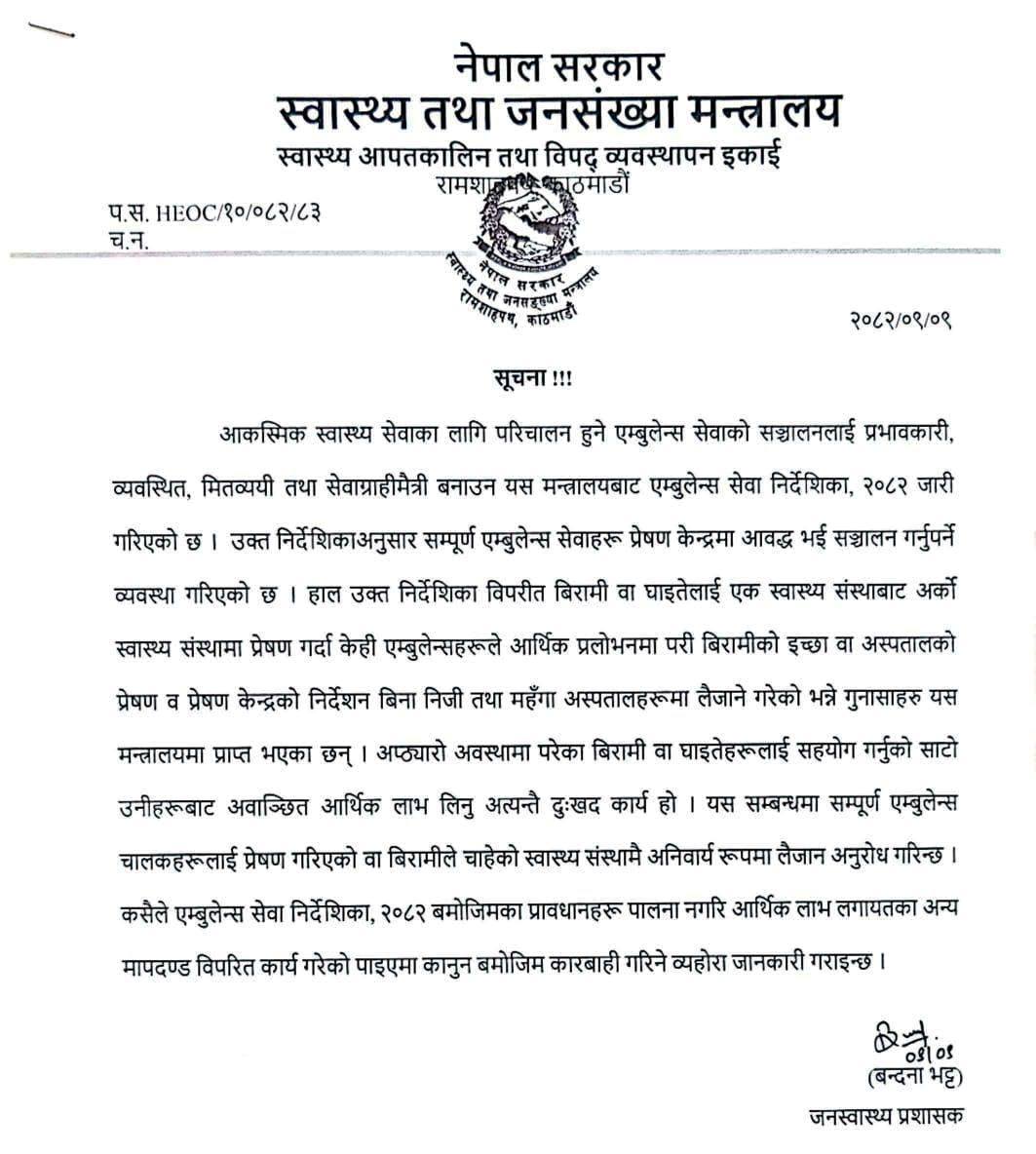 प्रवक्ता डा बूढाथोकीले उक्त निर्देशिकाविपरीत बिरामी वा घाइतेलाई एक स्वास्थ्य संस्थाबाट अर्को स्वास्थ्य संस्थामा प्रेषण गर्दा केही एम्बुलेन्सले आर्थिक प्रलोभनमा पारी बिरामीको इच्छा वा अस्पतालको प्रेषण वा प्रेषण केन्द्रको निर्देशनविना निजी तथा महँगो अस्पतालमा लैजाने गरेको गुनासो मन्त्रालयमा आएको बताए ।