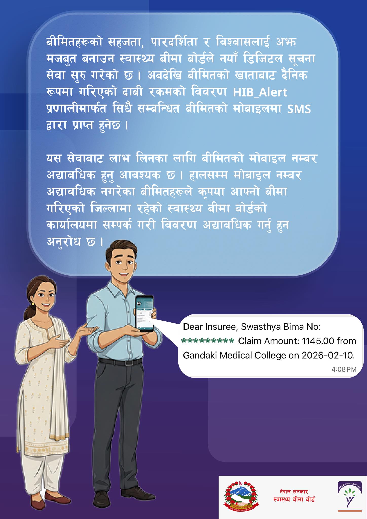 स्वास्थ्य बिमा बोर्डले सूचना जारी गर्दै अबदेखि बिमितको खाताबाट दैनिक रुपमा गरिएको विवरण एचआईवी एलर्ट प्रणालीमार्फत सम्बन्धित बिमितको मोबाइलमा एसएमएसद्वारा प्राप्त हुने जानकारी गराएको छ ।