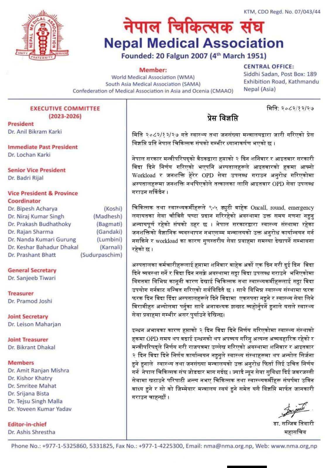 काठमाडौँ । स्वास्थ्य तथा जनसङ्ख्या मन्त्रालयले आइतबार पनि बहिरङ्ग (ओपिडी) सेवा सञ्चालन गर्न निर्देशन दिएपछि नेपाल चिकित्सक सङ्घले गम्भीर ध्यानाकर्षण भएको बताउँदै सो निर्णयमा पुनर्विचार गर्न माग गरेको छ ।