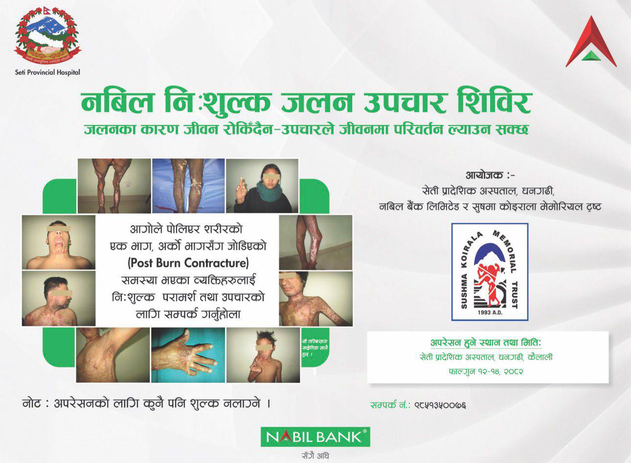 सेती प्रादेशिक अस्पताल, नबिल बैक लिमिटेड , सुष्मा कोईराला मेमोरीयल ट्रष्टको आयोजनामा उक्त नि शुल्क शिबिर हुन लागेको हो ।