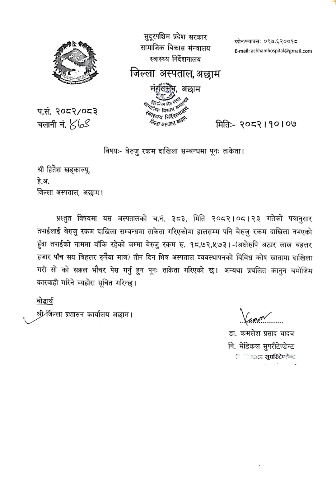 तर, त्यही अस्पतालको स्टोर र क्यास काउन्टरबाट झन्डै ७० लाख रुपैयाँ बराबरको नगद र औषधि रहस्यमय ढङ्गले गायब पारिएको छ। यो लुटतन्त्रको कथा यतिमा मात्र सीमित छैन; भ्रष्टाचारको यो जालो सिधै सुदूरपश्चिम प्रदेशको मुख्यमन्त्री कार्यालय र सामाजिक विकास मन्त्रालयको शक्ति केन्द्रसम्म पुगेर जोडिएको छ।