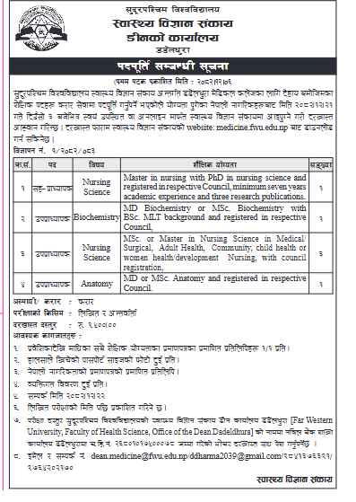 करार सेवाका लागि नर्सिङ साईन्स बिययको सह प्राध्यापक १ , बायोकेमेष्ट्री बिषयको उप प्राध्यापक १ , नर्सिङ साईन्सको उपप्राध्यापक ३ र एनाटोमी बिषयको उपप्राध्यापक १ माग गरेको छ ।
